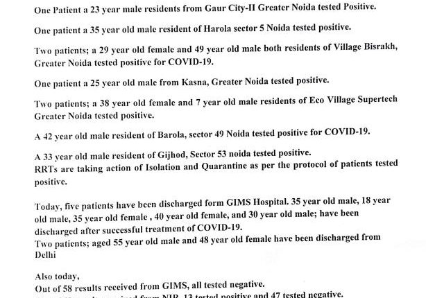 जिला प्रशासन द्वारा जारी की गई प्रेस रिलीज के मुताबिक आज नोएडा के नंगला सेक्टर 81 में दो 27 वर्षीय युवती व एक 23 वर्षीय युवक को कोरोना की पुष्टि हुई है।