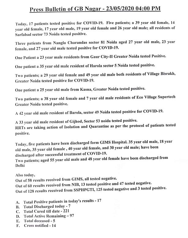 गौतम बुद्ध नगर में कोरोना वायरस से संक्रमित मरीजों का आंकड़ा लगातार बढ़ रहा है। यहां दिन प्रतिदिन कोरोना से संक्रमित मरीज सामने आ रहे हैं। आज जिले में कोरोना के 17 नए मरीज मिले हैं। जिसके बाद मरीजों का आंकड़ा और बढ गया है। हालांकि लगातार जिले में कोरोना मरीजों को डिस्चार्ज भी किया जा रहा है।