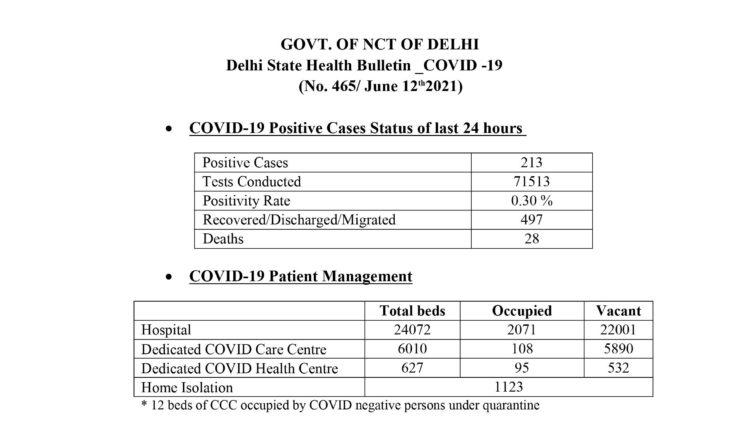 नई दिल्ली :– दिल्ली में कोरोना का कहर जारी है , संक्रमितों की संख्या में गिरावट देखने को मिल रही है , साथ ही आज मौतों का आंकड़ा ज्यादा देखने को मिला। 24 घण्टे में 213 लोग संक्रमित हुए है। साथ ही 28 मरीजों की मौत कोरोना वायरस से हुई है। आपको बता दें कि 24 घण्टे के अंदर 71 हज़ार 513 लोगों के कोरोना टेस्ट हुए है ।