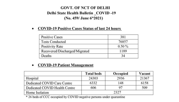 नई दिल्ली :– दिल्ली में कोरोना का कहर जारी है , संक्रमितों की संख्या में गिरावट देखने को मिल रही है , साथ ही आज मौतों का आंकड़ा कम देखने को मिला। 24 घण्टे में 381 लोग संक्रमित हुए है। साथ ही 34 मरीजों की मौत कोरोना वायरस से हुई है। आपको बता दें कि 24 घण्टे के अंदर 76 हज़ार 857 लोगों के कोरोना टेस्ट हुए है ।