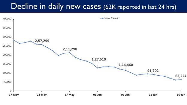 India continues to report a sustained slide in the daily new COVID cases. The country has reported 62,224 Daily New Cases in the last 24 hours. Less than 1 lakh Daily New Cases have been reported for 9 continuous days now. This is a result of sustained and collaborative efforts by the Centre and the States/UTs.