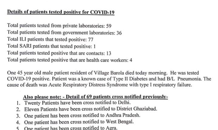 इससे पहले आज प्रदेश के मुख्यमंत्री योगी आदित्यनाथ ने गौतम बुद्ध नगर में स्वास्थ्य सेवाओं पर और जोर देने की बात कही थी। 95 नये मरीज मिलने के बाद कुल कोरोना केसों की संख्या 830 हो गई है।