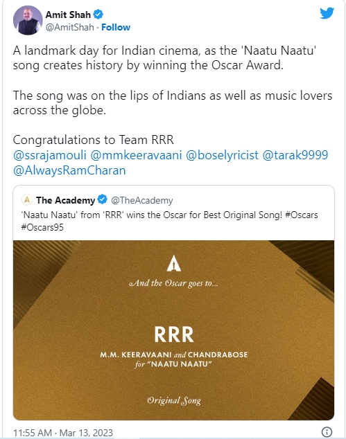 In his tweet Union Home Minister and Minister of Cooperation said, “A landmark day for Indian cinema, as the ‘Naatu Naatu’ song creates history by winning the Oscar Award. The song was on the lips of Indians as well as music lovers across the globe. Congratulations to Team RRR @ssrajamouli @mmkeeravaani @boselyricist @tarak9999 @AlwaysRamCharan.”