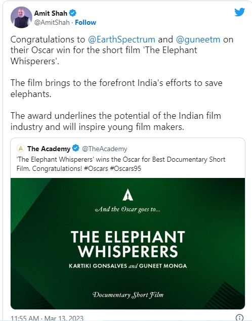 In another tweet Amit Shah said, “Congratulations to @EarthSpectrum and @guneetm on their Oscar win for the short film ‘The Elephant Whisperers’. The film brings to the forefront India’s efforts to save elephants. The award underlines the potential of the Indian film industry and will inspire young film makers.”