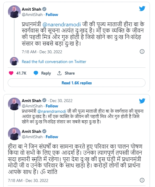 In his tweets condoling her passing away, Amit Shah said that the news of the demise of respected Mataji Heera Ba of Prime Minister, Shri Narendra Modi is extremely sad. A mother is the first friend and teacher in a person’s life, the pain of losing one’s mother is undoubtedly the greatest pain.