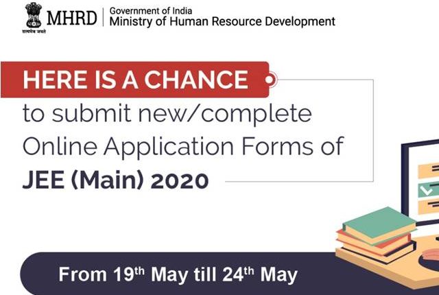 It is brought to the notice of all, that the facility of submission/ completion of Online Application Form will be available on the website jeemain.nta.nic.infrom 19.05.2020 to 24.05.2020* only.