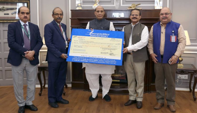 Bharat Electronics Limited, BEL, presented the 140% final dividend cheque of Rs. 174,43,63,569.20/- (Rupees One Hundred Seventy-four Crores Forty-Three Lacs Sixty-three Thousand Five Hundred Sixty-nine and Twenty Paise only), payable on the shares held by the President of India. The Cheque was presented to the Raksha Mantri, Shri Rajnath Singh by the Chairman & Managing Director, BEL, Shri M V Gowtama here today. The Interim Dividend of 140% (on face value of Re. 1 per equity share) was paid to the Government of India in February 2020.