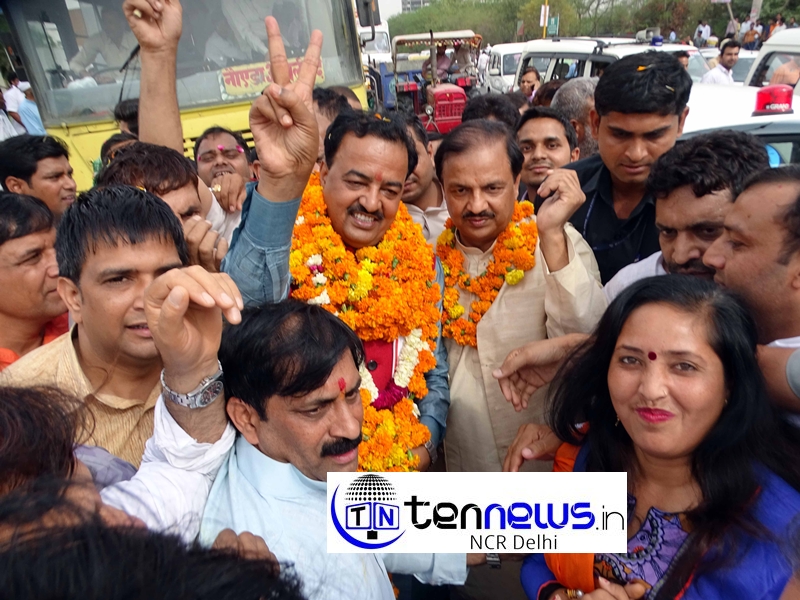 ग्रेटर नोएडा के परीचौक पर बीजेपी के प्रदेश अध्यक्ष केशव प्रसाद मौर्य और केन्द्रीय मंत्री डॉ महेश शर्मा का स्वागत करते बीजेपी के कार्यकर्ता
