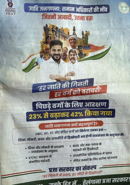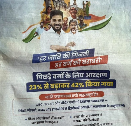 Hyderabad, July 18 (IANS) The advertisements of Telangana’s Congress government about the caste census and increase in the reservation for Backward Classes, published in some Hindi newspapers in Bihar, have raised eyebrows in some quarters.