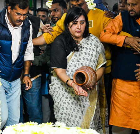 Early Friday morning, MP Bansuri Swaraj visited the crematorium again for the traditional ritual of collecting the ashes.