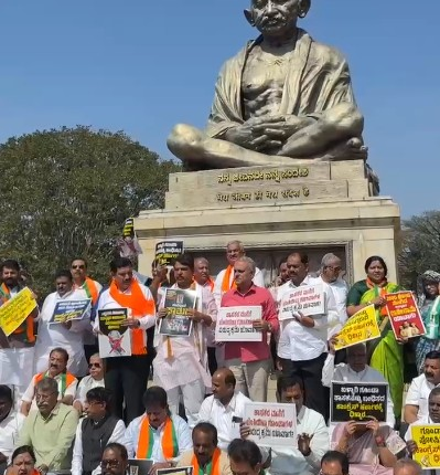 Bengaluru, Jan 27 (IANS) The BJP in Karnataka staged a protest in front of the Mahatma Gandhi statue in Vidhan Soudha on Tuesday, demanding the resignation of Excise Minister R.B. Thimmapur over an alleged excise scam amounting to Rs 2,500 crore.