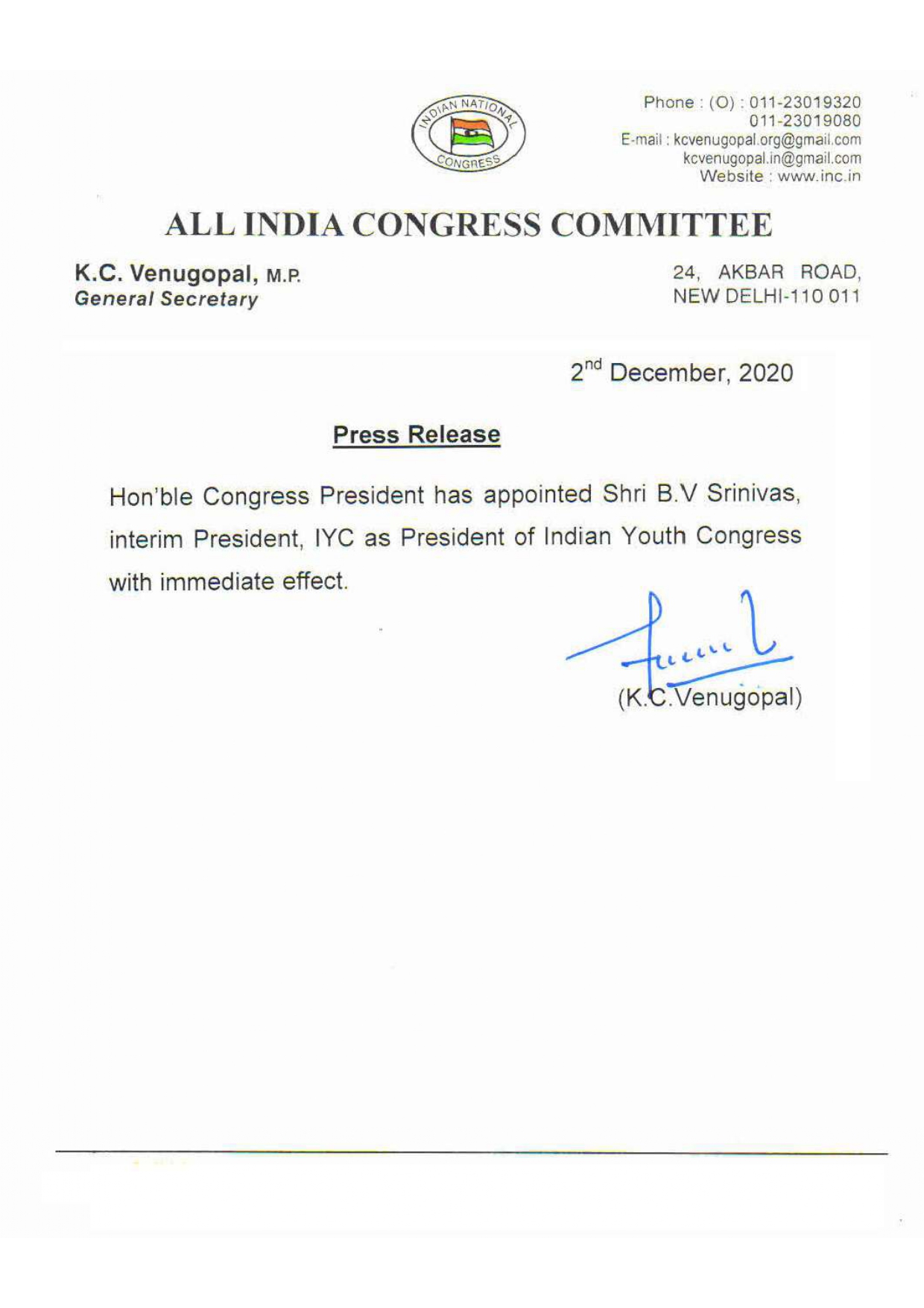 National B.V Srinivas appointed as interim chief of Indian Youth Congress Ten News Network On Dec 2, 2020 Share Share FacebookTwitterGoogle+ReddItWhatsAppPinterestEmail