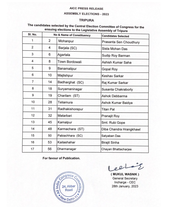 New Delhi (28/01/2023): Congress announces a list of 17 candidates for the upcoming Tripura Elections 2023. Sudip Roy Barman to contest from Agartala.