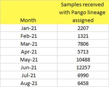 The Month-wise samples received at NCDC with Pango lineages (from various INSACOG labs):