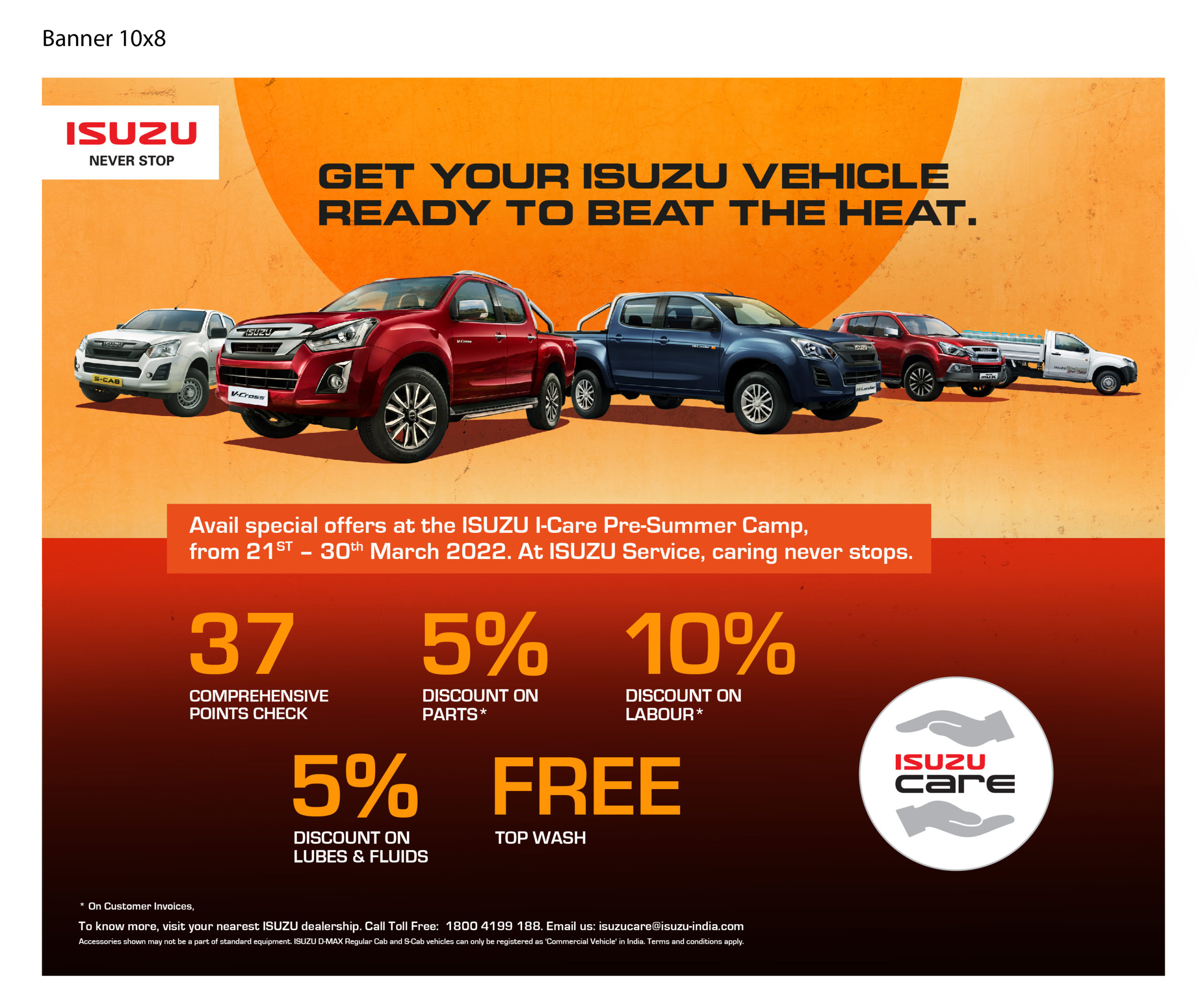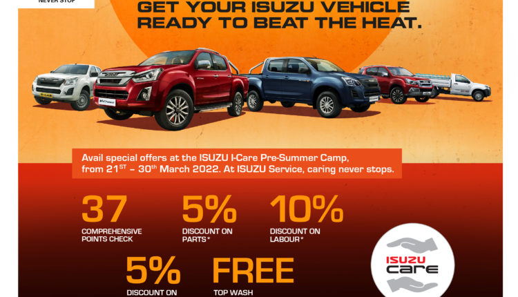 An initiative of ‘ISUZU Care’, the Pre-Summer service camp will be organised across all ISUZU authorised dealer service outlets, between 21sh and 30th March, 2022 (both days inclusive). During this period, customers can also avail special offers & benefits for their vehicles.