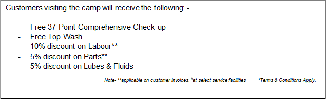 The Pre-Summer Service Camp will be organised at all authorised service facilities of ISUZU located in Ahmedabad, Anantapur, Bengaluru, Bimavaram, Bhuj, Calicut, Chennai, Coimbatore, Delhi, Dimapur, Gandhidham, Gorakhpur, Gurugram, Guwahati, Hyderabad, Indore, Jaipur, Jalandhar, Jodhpur, Kochi, Kolkata, Kurnool, Lucknow, Madurai, Mangalore, Mehsana, Mohali, Mumbai, Nagpur, Nellore, Pune, Raipur, Rajahmundry, Rajkot, Siliguri, Surat, Tirupati, Trivandrum, Vadodara, Vijayawada and Visakhapatnam.