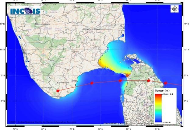 It is very likely to intensify further during next 12 hours. It is very likely to move west-northwestwards and cross Sri Lanka coast, close to north of Trincomalee during evening/night of 2nd December as a Cyclonic Storm with a wind speed of 80-90 kmph gusting to 100 kmph. It is very likely to move nearly west-northwestwards thereafter, emerge into Gulf of Mannar and adjoining Comorin area on 3rd December morning.
