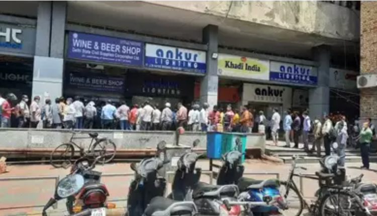 New Delhi: The 6-day lockdown imposed by the Delhi govt today invoked large number of people to queue outside liquor shops in different regions of Delhi including Khan Market and Gole Market area.