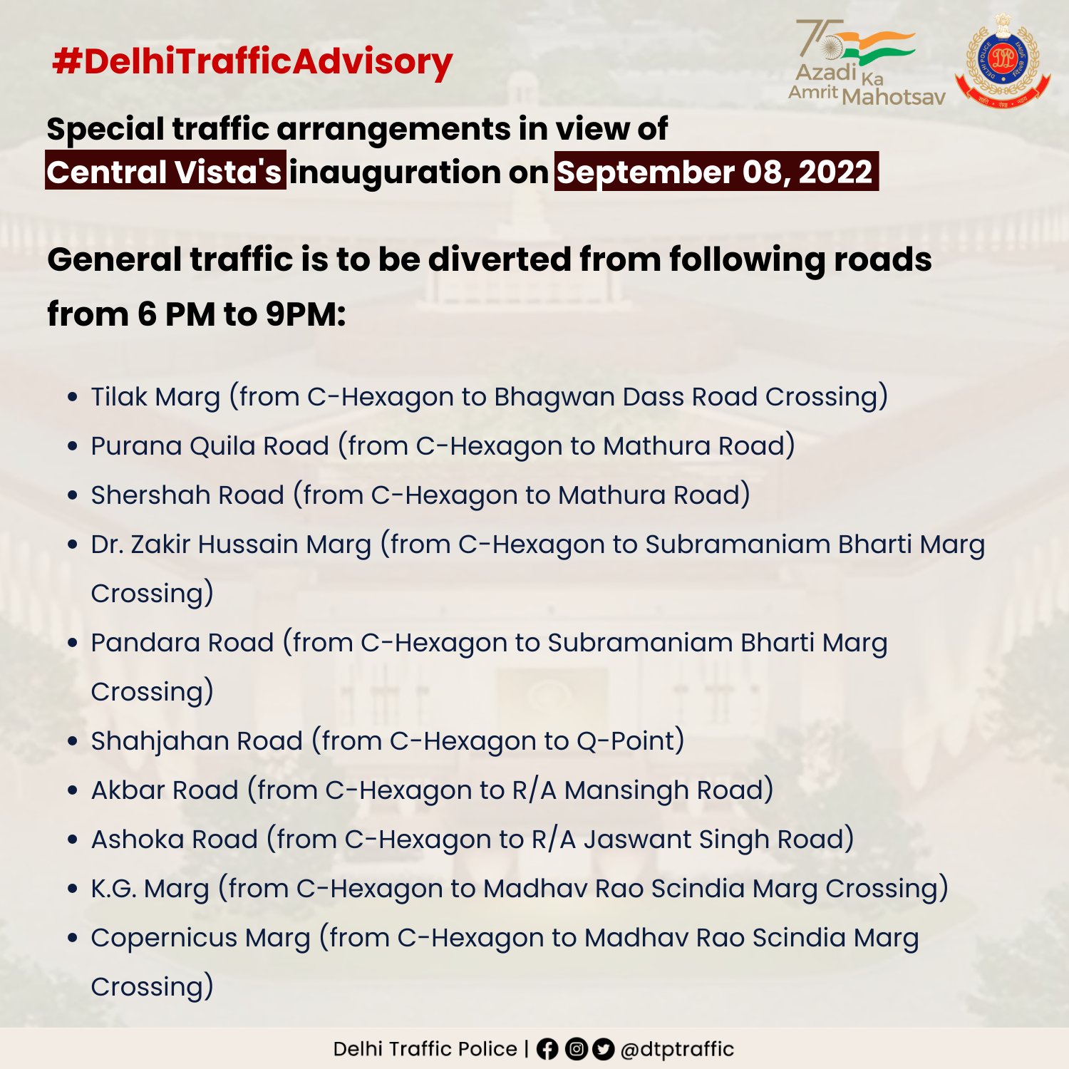 Breaking Delhi Traffic Police issues advisory for traffic arrangement in view of Central Vista inauguration Ten News Network On Sep 8, 2022 Share New Delhi (08/09/2022): Delhi Traffic Police issues advisory for traffic arrangement in view of Central Vista inauguration. Central VistaDELHI TRAFFIC POLICE Share FacebookTwitterGoogle+ReddItWhatsAppPinterestEmail