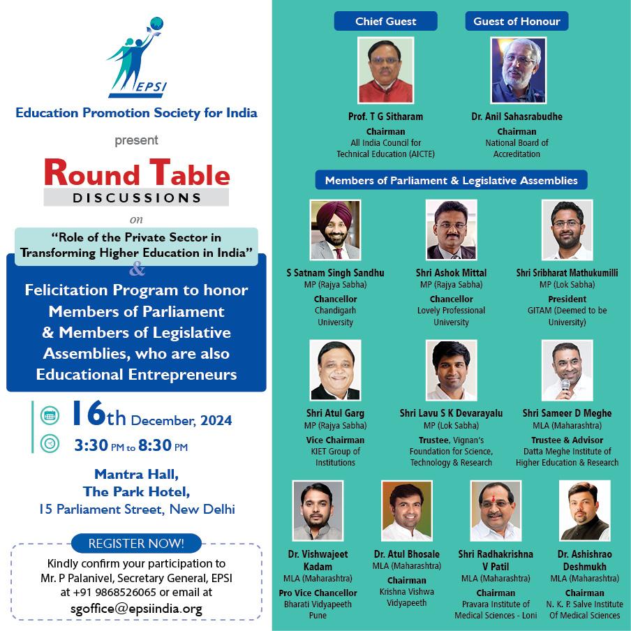 New Delhi (14 December 2024): The Education Promotion Society for India (EPSI) is set to organize a pivotal event addressing the “Role of the Private Sector in Transforming Higher Education in India.” Scheduled for Monday, December 16, 2024, this program will also honor Members of Parliament (MPs) and Legislative Assemblies (MLAs) who have contributed to the education sector as entrepreneurs.