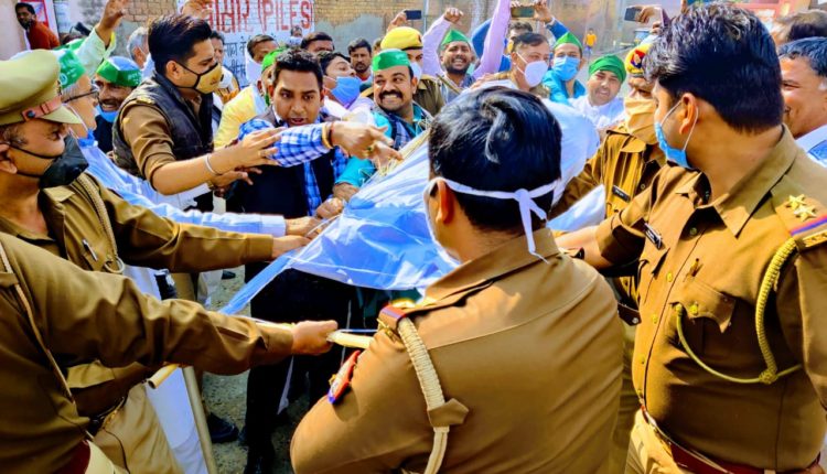 ग्रेटर नोएडा : कृषि कानूनों के विरोध भारत बंद पर किसान एकता संघ ने निकाली तीनों कानूनों की शवयात्रा
