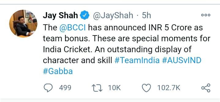 एक तरफ टीम इंडिया ने BCCI और देश को तोहफा दिया वहीं दूसरी तरफ BCCI सचिव जय शाह ने टीम इंडिया को तोहफा दे दिया और ट्वीट करके लिखा कि, “भारतीय टीम की इस शानदार जीत के लिए 5 करोड़ का बोनस दिया जाएगा।” उन्होंने टीम की इस जीत को यादगार लम्हा बताया।