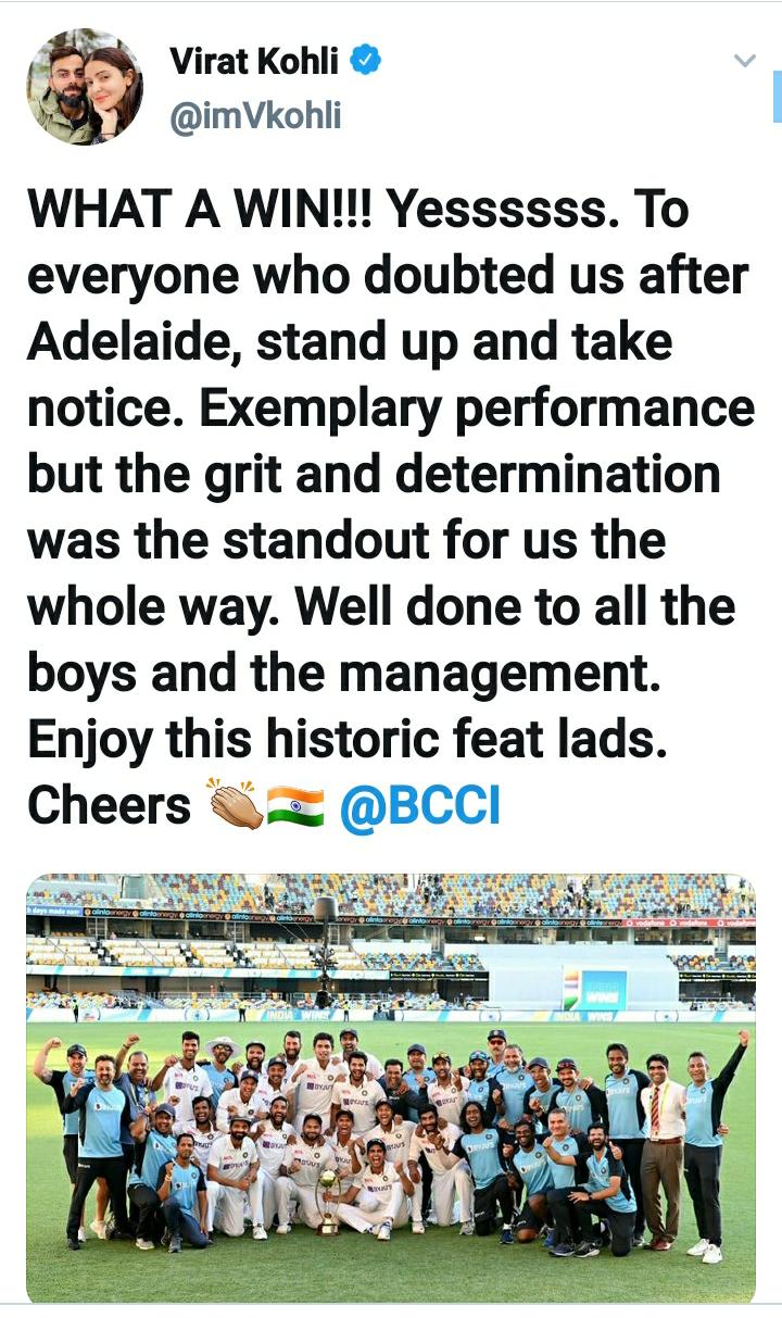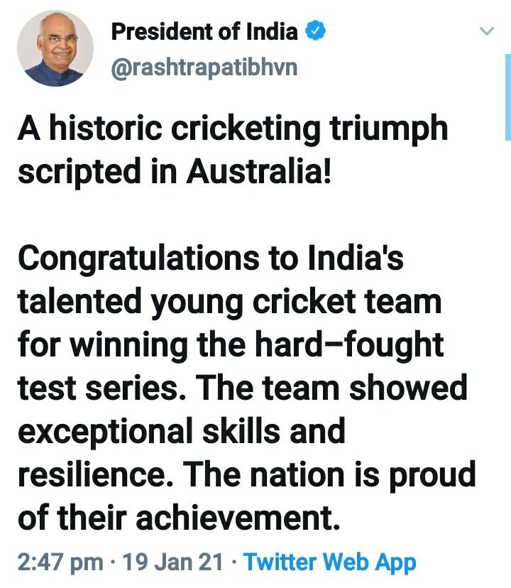इसी कड़ी में गृह मंत्री अमित शाह ने ट्वीट करके लिखा कि, “ऐतिहासिक सीरीज जीत दर्ज करने के लिए भारतीय क्रिकेट टीम को सलाम। संपूर्ण राष्ट्र को आपकी उल्लेखनीय उपलब्धि पर गर्व है। वेल प्लेड टीम इंडिया!”