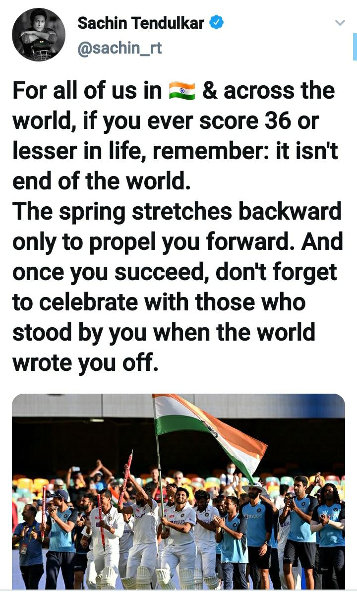 बधाई और शुभकामनाओं का सिलसिला यहीं नहीं रुका, भारतीय क्रिकेट के भगवान कहे जाने वाले सचिन ने ट्वीट किया कि, “भारत में रहने वाले सभी और पूरी दुनिया के लोगों के लिए अगर आप कभी भी 36 या इससे कम का स्कोर अपने जीवन में करते है तो यह याद रखना, इससे दुनिया खत्म नहीं हो जाती है। जो स्प्रिंग होती है वो आपको नीचे सिर्फ इस लिए खींचती है ताकी आप उपर की तरफ जा सके। एक बार जा आपको सफलता मिले तो उनको कभी मत भूलना जो आपके साथ कब खड़े थे। जब पूरी दुनिया ने आपको हारा हुआ मान लिया था।”