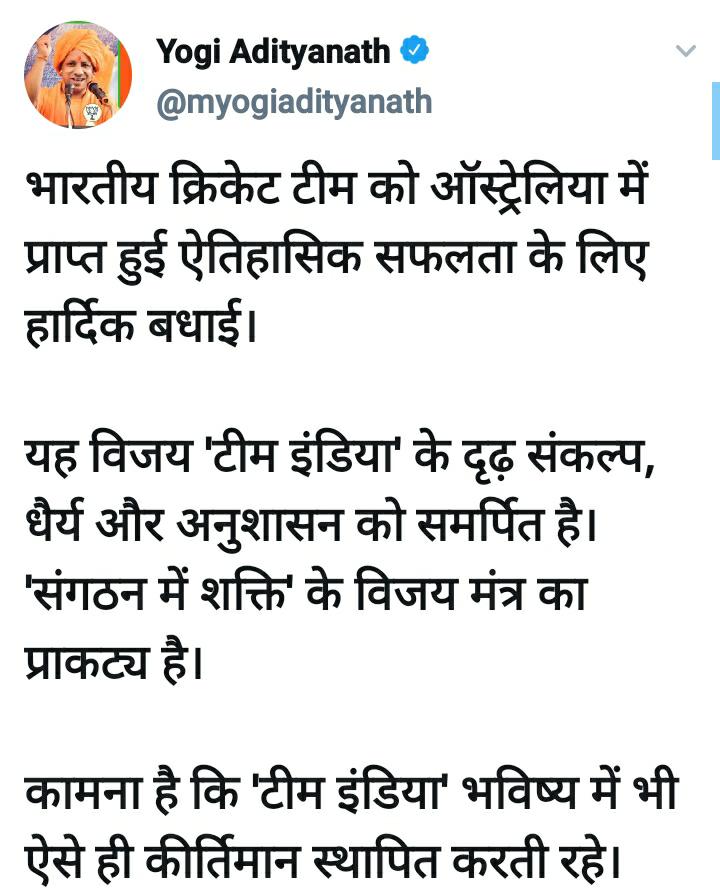 पीएम मोदी ने अपने ट्वीट में लिखा कि, “हम सभी ऑस्ट्रेलिया में टीम इंडिया की सफलता से खुश हैं। उनकी ऊर्जा और जुनून पूरे मैच के दौरान दिखा। उनका दृढ़ इरादा, उल्लेखनीय धैर्य और दृढ़ संकल्प भी दिखाई दिया। टीम को बधाई! भविष्य के लिए शुभकामनाएं।”
