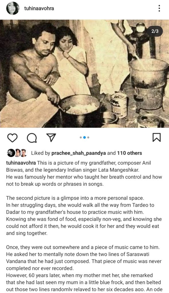 Taking to Instagram, Tuhinaa penned a lengthy post revealing that her grandfather and late music director Anil Biswas had mentored Lata Mangeshkar. He had taught her how not to break up words while singing.