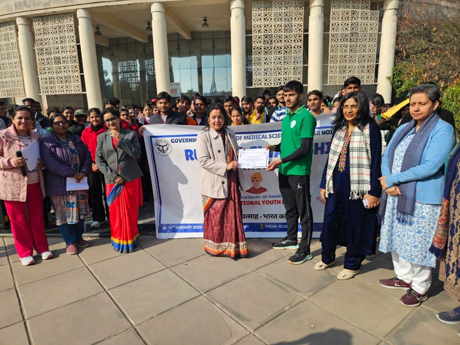 GREATER NOIDA News (12/01/2025): The Government Institute of Medical Science (GIMS), Greater Noida, organised a special awareness and fitness programme titled “Run for Swadeshi” on Monday to commemorate National Youth Day, observed on the birth anniversary of Swami Vivekananda. The initiative was held under the mentorship of Brigadier (Dr.) Rakesh Kumar Gupta and aimed at inspiring youth to embrace the ideals of self-reliance, discipline and national unity.