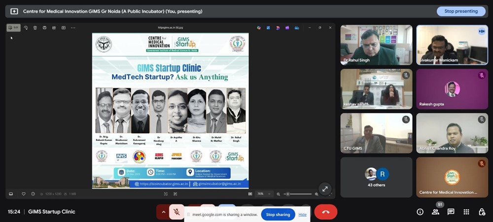 The online event, hosted from the GIMS campus, brought together MedTech startups from across the country along with eminent clinicians, engineers, and innovation leaders from premier institutions including IIT Guwahati, IIT Gandhinagar, AIIMS Bilaspur (Himachal Pradesh), JIPMER Puducherry, and GIMS. The Startup Clinic enabled direct, clinician-led engagement with startups to discuss the development of cost-effective, scalable medical devices tailored to India’s healthcare needs.