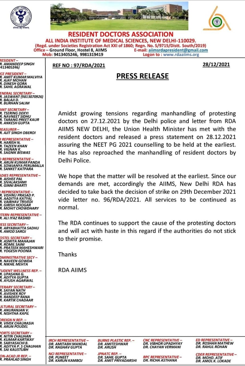 एम्स दिल्ली आरडीए ने एक आधिकारिक विज्ञप्ति में कहा कि केंद्रीय स्वास्थ्य मंत्री ने रेजीडेंट डॉक्टरों से मुलाकात की और आश्वासन दिया कि नीट पीजी 2021 की काउंसलिंग जल्द से जल्द कराई जाएगी। एम्स दिल्ली आरडीए ने 29 दिसंबर को होने वाली हड़ताल को वापस लेने का फैसला किया है। सभी सेवाएं सामान्य रूप से जारी रहेंगी।