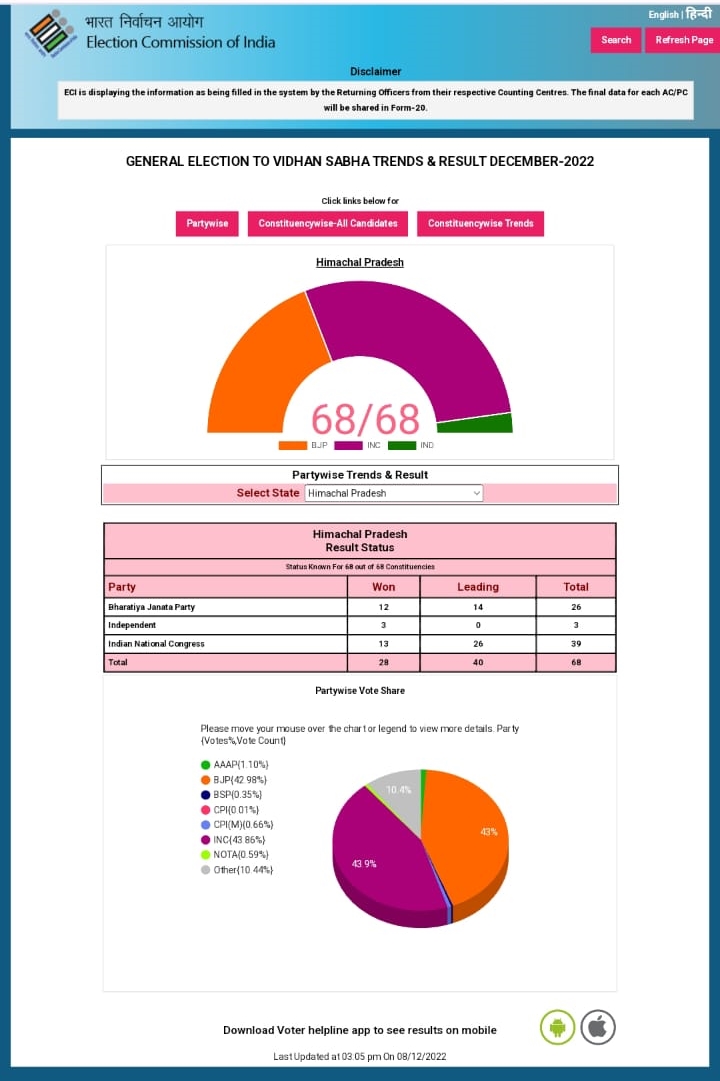 नई दिल्ली (08/12/2022): चुनाव आयोग के अनुसार हिमाचल प्रदेश में भारतीय जनता पार्टी ने 12 सीटों पर जीत दर्ज़ की है और 14 सीटों पर आगे चल रही है जबकि कांग्रेस ने 13 सीट पर जीत दर्ज़ की है और 26 सीटों पर आगे चल रही है। तो वहीं निर्दलीय उम्मीदवारों ने 3 सीट पर जीत दर्ज़ किया है। मतगणना प्रकिया जारी है।।