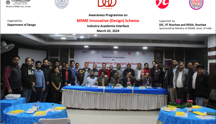 02, 03, 2024: In a concerted effort to bolster the integration of innovative design practices within the Indian Micro, Small & Medium Enterprises (MSME) sector, an insightful Awareness Programme on the ‘MSME Innovative (Design) Scheme’: Industry–Academia Interface was held on March 2, 2024, with the collaborative support of Roorkee Small Scale Industrial Association (RSSIA), Design Innovation Center at IIT Roorkee, and DFO, MSME Haldwani. The event aimed to further bridge the gap between industry and academia in fostering design-driven innovation.