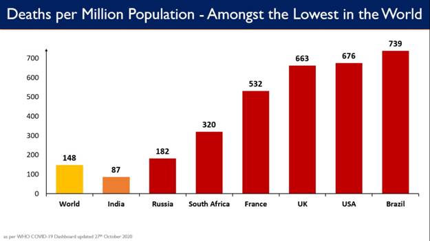The deaths per million populations in India areĀ 87, substantially lower than the world average of 148. India’s targeted strategies in COVID-19 management and the proactive as well as calibrated public health response over the last several months have resulted in encouraging outcomes.