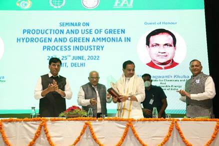 New Delhi (24/06/2022): Union Minister for Chemicals and Fertilizers and Health & Family Welfare, Dr Mansukh Mandaviya addressed a two-day seminar being organized on the subject ‘Production and use of Green Hydrogen and Green Ammonia in Process Industry’ by Department of Chemical Engineering, IIT Delhi, Indian Institute of Chemical Engineers (Northern Regional Centre) in association with Fertilizer Association of India (FAI) at IIT Delhi Campus, Hauz Khas New Delhi. Bhagwant Khuba, Minister of State for Chemical & Fertilizers was also present in the meeting.