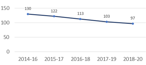 As per the statistics derived from Sample Registration System (SRS), the country has witnessed a progressive reduction in MMR from 130 in 2014-2016, 122 in 2015-17, 113 in 2016-18, 103 in 2017-19 and to 97 in 2018-20 as depicted below: