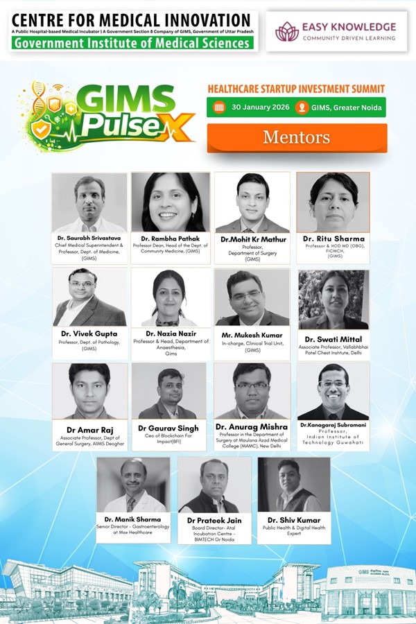 Doctors from leading public and private medical institutions, including GIMS, AIIMS, Maulana Azad Medical College, Patel Chest Institute, and other reputed hospitals, are expected to participate. Specialists from multiple disciplines, many of whom also serve as clinical mentors at the Centre for Medical Innovation (CMI), GIMS, will guide startups through structured and focused clinical discussions.