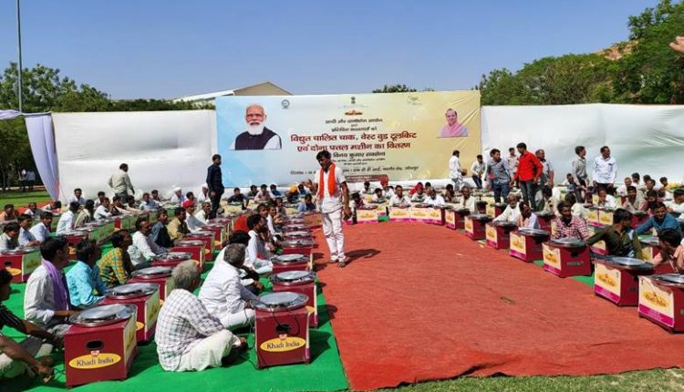 New Delhi (27/03/2022): In a major boost to the self-employment spree in Rajasthan, Khadi and Village Industries Commission (KVIC) on Saturday distributed 200 electric potter wheels to potters, 240 waste wood toolkits to Carpenters and 10 dona paper plate making machines to 450 local artisans in Jodhpur. KVIC Chairman VInai Kumar Saxena distributed the machines to these khadi artisans from Jaisalmer, Barmer and Nagaur districts that have been trained by KVIC. The distribution of machines will create direct employment for nearly 1100 people. These beneficiaries also include 170 BPL families.