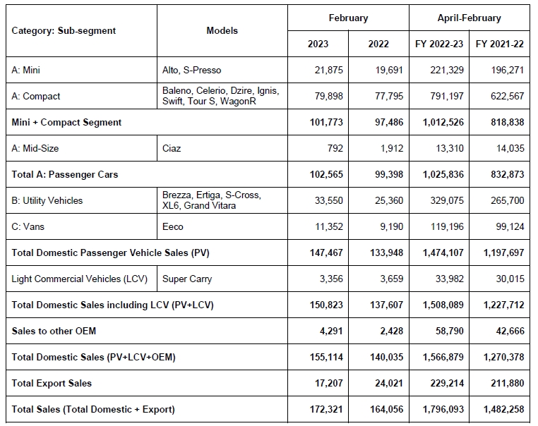 New Delhi, March 1, 2023: Maruti Suzuki India Limited sold a total of 172,321 units in February 2023. Total sales in the month include domestic sales of 150,823 units, sales to other OEM of 4,291 units and exports of 17,207 units.