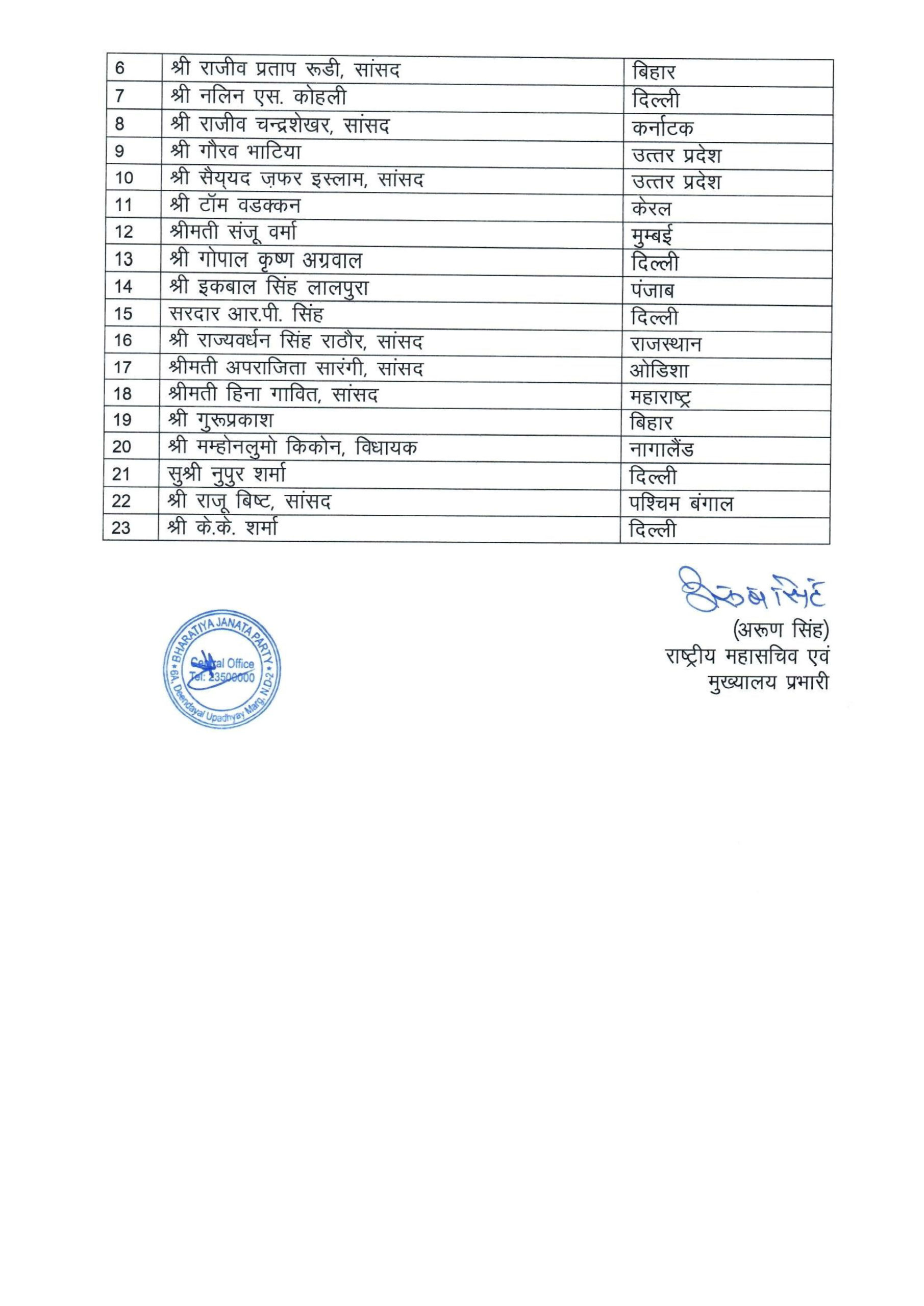 NationalNew Delhi List : BJP National Office Bearers finalised by BJP National President Shri J.P. Nadda Ten News Network On Sep 27, 2020 Share List : BJP National Office Bearers finalised by BJP National President Shri J.P. Nadda Share FacebookTwitterGoogle+ReddItWhatsAppPinterestEmail