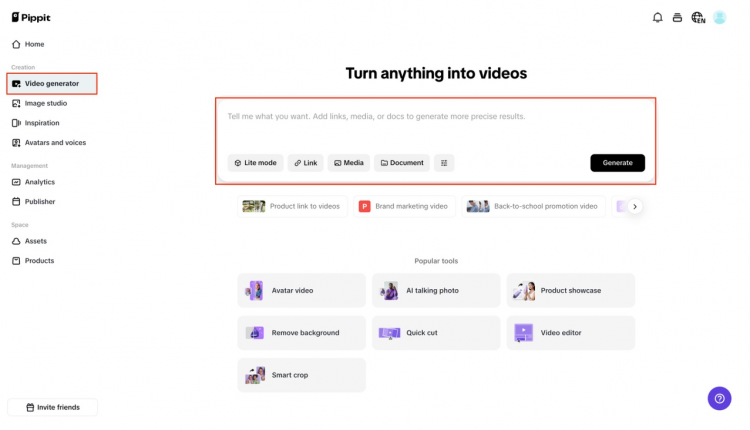 Head to the Pippit homepage, open the Video generator, and enter your product link or upload clips. You can also personalize with Avatar, Script, or Voice to give your ad a unique touch.