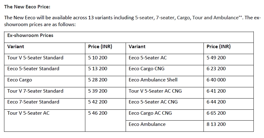 Commenting on the launch of New Eeco, Shashank Srivastava, Senior Executive Officer, Marketing & Sales, Maruti Suzuki India Limited, said, “Since its launch, the Eeco has been a preferred and proud choice for over 9.75 lakh owners in the past decade and enjoys an undisputed leadership with 93% market share in its segment. Being a part of families and having provided livelihood to lakhs of entrepreneurs and businessmen, the New Eeco will continue to be a reliable and efficient vehicle. It will cater to a wide range of customer preferences as a comfortable, stylish and spacious family vehicle, while also providing flexibility for business use. This versatile multi-purpose van with an advanced powertrain, improved mileage and new features embodies pride of ownership and living life to the fullest. It represents a whole new attitude, with fresh confidence in its latest avatar. We are confident that the Eeco will continue to dominate its segment and receive much more adulation by consumers.