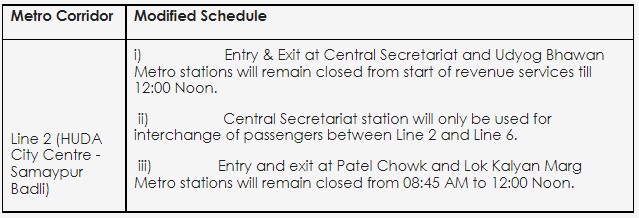 New Delhi (24/01/2022): The services on Line-2 (HUDA City Centre – Samaypur Badli) of the Delhi Metro will be partially regulated on Wednesday, the 26th of January, 2022 (Republic Day). This is being done as part of the security arrangements for the Republic Day celebrations as per the instructions of Delhi Police as per the following plan :