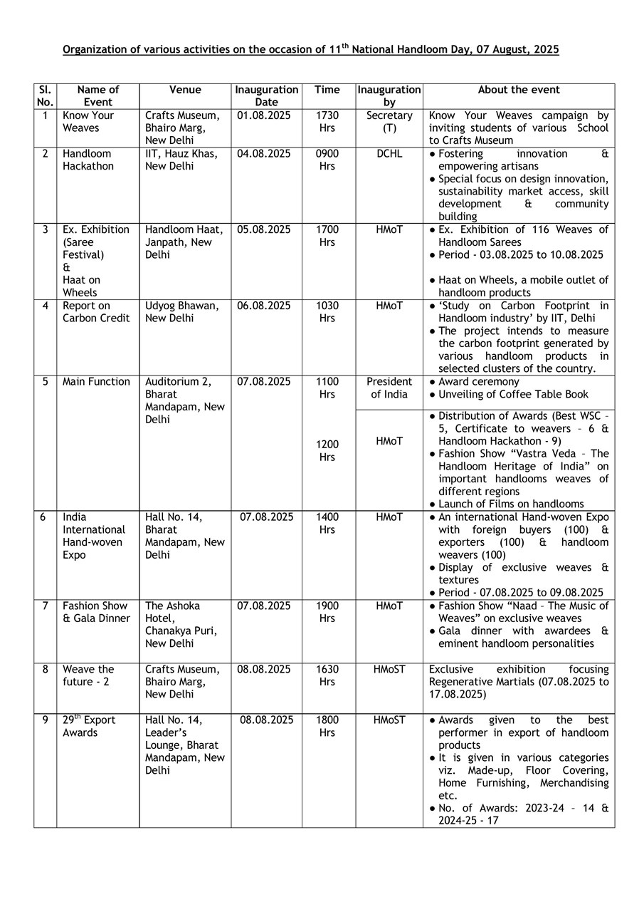 Apart from the main function on 07th August, 2025, the other signature events planned during 1st to 8th August 2025 include, display of award-winning handloom samples; live loom demonstration; unveiling – “Haat on Wheels” (a mobile handloom outlet initiative); exclusive handloom sari exhibition cum sale at Handloom Haat, Janpath, New Delhi; Exclusive exhibition focusing regenerative martials at Craft Museum, New Delhi; Loom Hackathon by IIT Delhi; International Hand-woven Expo with Foreign buyers; exporters & handloom weavers; Awards to the best performer in export of handloom products etc. List of various activities planned during the period is attached.