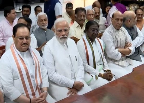PM Modi, Union Home Minister Amit Shah, BJP National President JP Nadda, Defence Minister Rajnath Singh Union Minister Piyush Goyal, Union Minister Nitin Gadkari, Union Minister for Tribal Affairs Arjun Munda, Union ministers and BJP leaders Gen VK Singh (Retd), Bhupender Yadav and Giriraj Singh were present at the Parliament during her nomination filing.