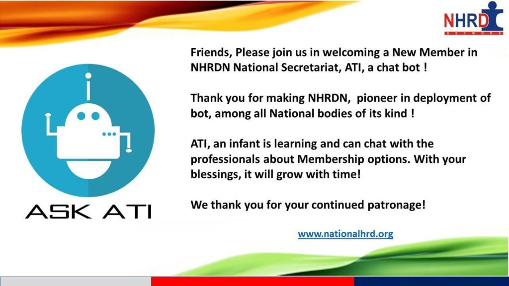 Greater Noida (13/11/18) : National HRD Network, the National Apex Body for development of human resources has introduced one of its kind bot, ATI for enabling better accessibility to its members spread all around the globe.