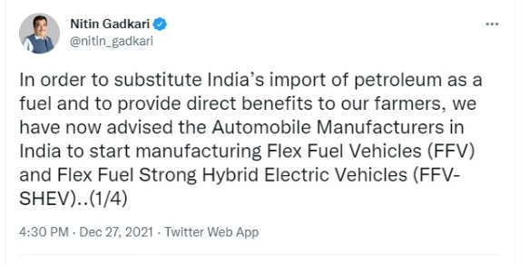 In a series of Tweets he said that in line with Prime Minister’s vision of Aatmanirbhar Bharat and government’s policy on promoting ethanol as a transport fuel, Flex Fuel Vehicles are capable to run on a combination of 100% Petrol or 100% bio-ethanol and their blends, along with strong Hybrid Electric technology in case of FFV-SHEVs.