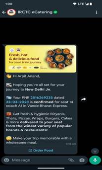 Initially, two stages implementation of e-catering services was planned through WhatsApp Communication. In the first phase, Business WhatsApp number will be sending a message to the customer booking e-ticket for opting for e-catering services through clicking the link www.ecatering.irctc.co.in.